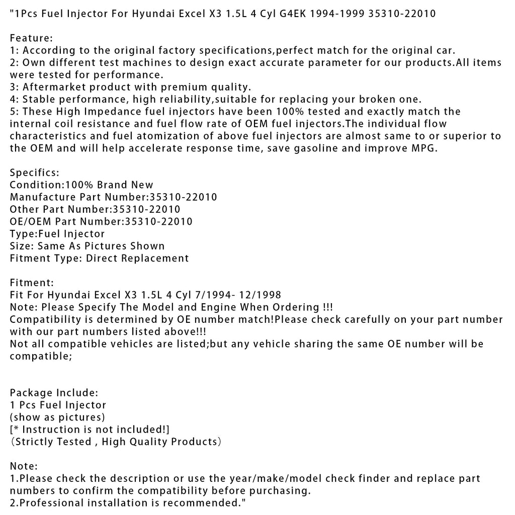 1 injecteur de carburant pour Hyundai Excel X3 1.5L 4 cylindres G4EK 1994-1999 35310-22010