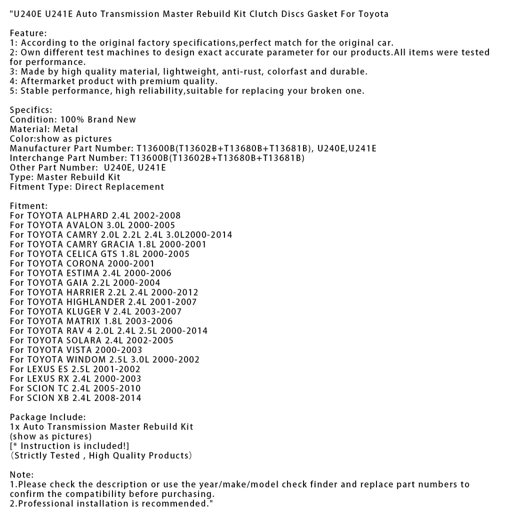 Kit de reconstruction de transmission automatique pour Toyota Avalon 3.0L 2000-2005, joints de disques d'embrayage T13600B U240E U241E