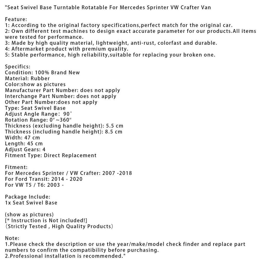 Base pivotante et plateau tournant pour siège, compatible avec les fourgonnettes Mercedes Sprinter et VW Crafter.