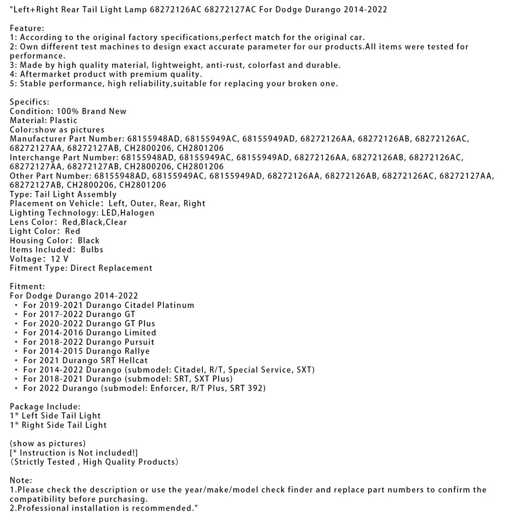 Feu arrière gauche et droit 68272126AC 68272127AC pour Dodge Durango 2014-2022