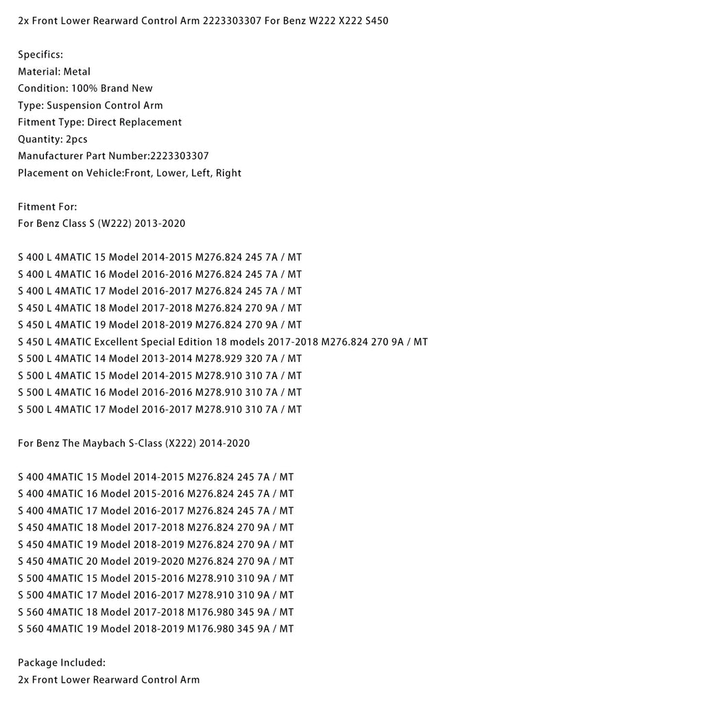 2 bras de suspension inférieurs avant arrière 2223303307 compatibles avec Mercedes-Benz W222 X222 S450