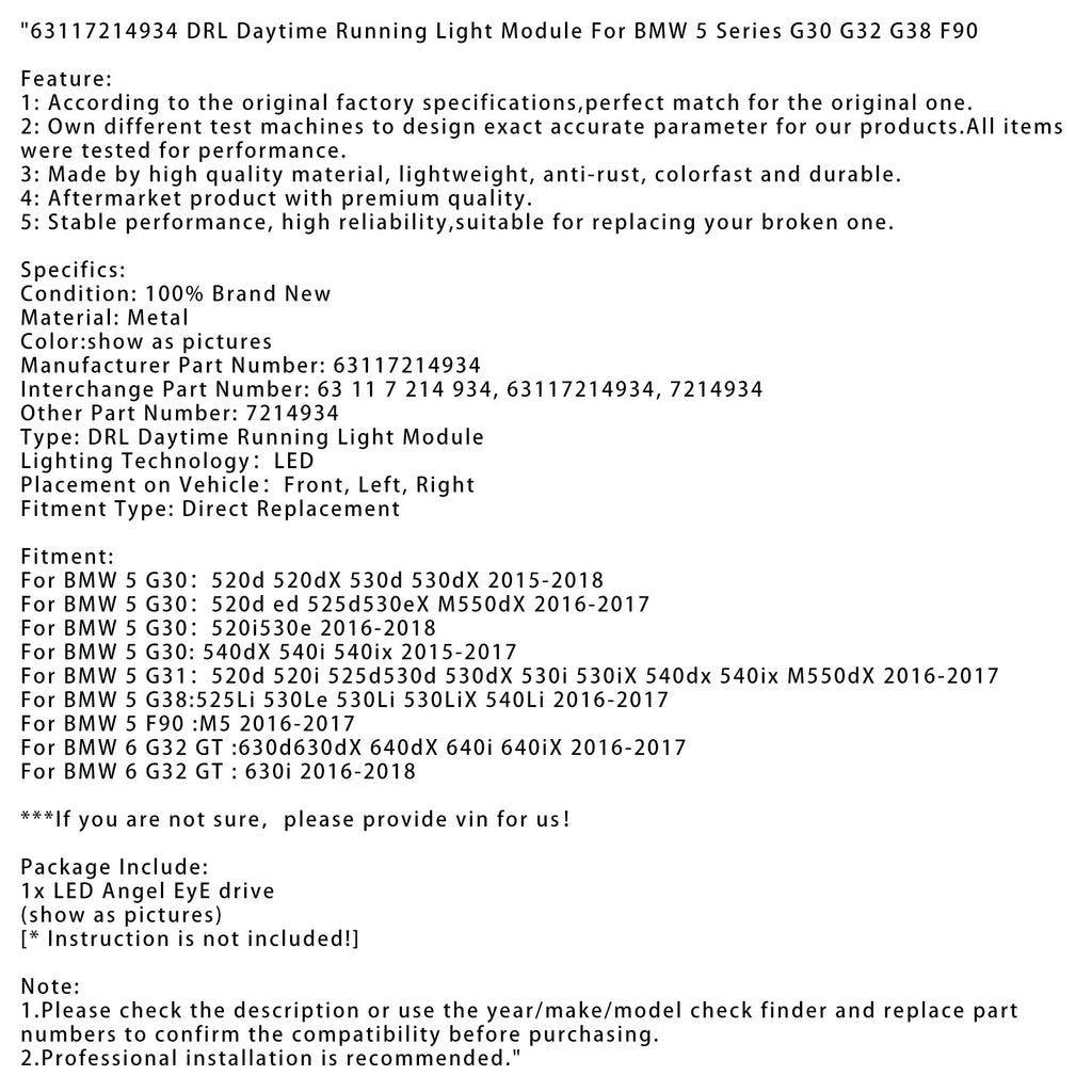 Module de feux de jour DRL 63117214934 pour BMW 5 G30 2016-2017 : 520d ed 525d530eX M550dX