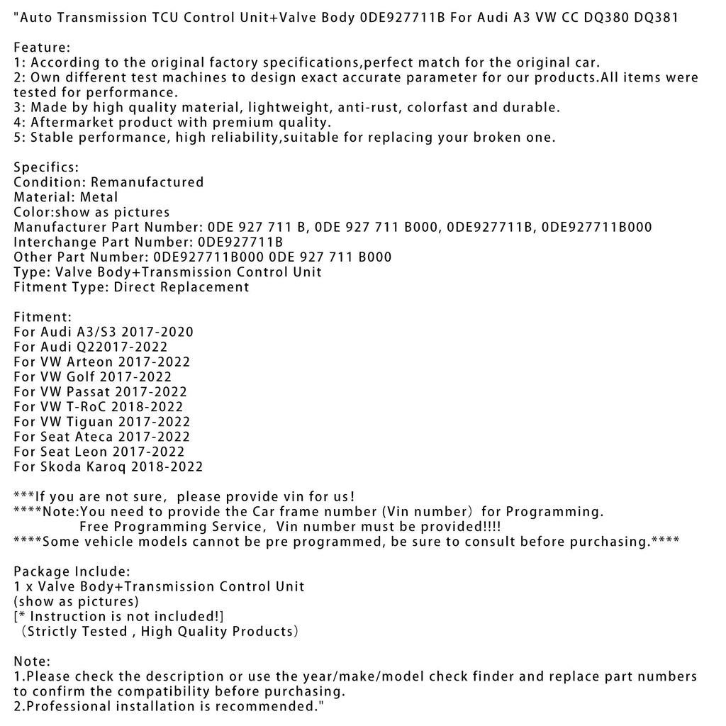 Unité de commande TCU de transmission automatique + corps de soupape 0DE927711B pour Audi A3 VW CC DQ380 DQ381