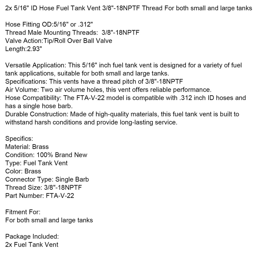 2 tuyaux de 5/16"" de diamètre intérieur pour évent de réservoir de carburant, filetage 3/8""-18NPTF pour petits et grands réservoirs
