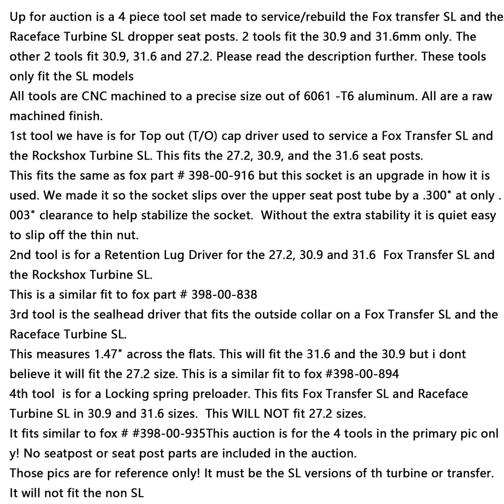 Un jeu d'outils de 4 pièces est proposé aux enchères pour l'entretien et la remise à neuf des tiges de selle télescopiques Fox Transfer SL et Raceface Turbine SL. Deux outils sont compatibles avec les diamètres de 30,9 et 31,6 mm. Les deux autres sont compatibles avec les diamètres de 30,9, 31,6 et 27,2 mm. Veuillez lire la description plus en détail. Ces outils sont compatibles uniquement avec les modèles SL.