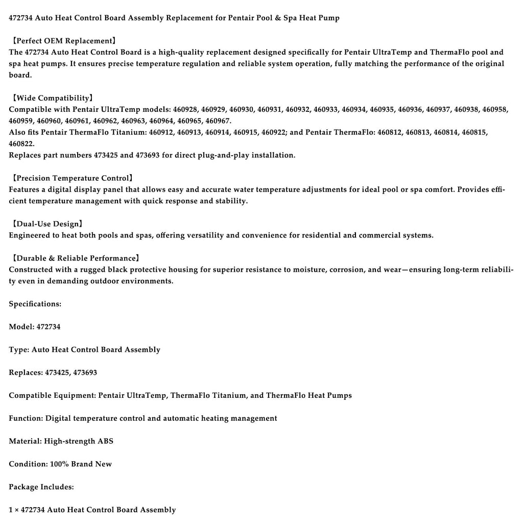 Carte de commande de chauffage automatique 472734 de remplacement pour pompe à chaleur Pentair pour piscine et spa