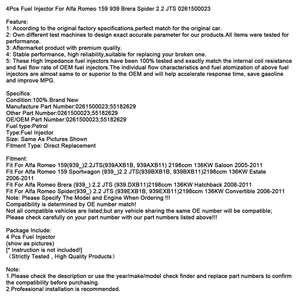 4 injecteurs de carburant pour Alfa Romeo 159 939 Brera Spider 2.2 JTS 0261500023