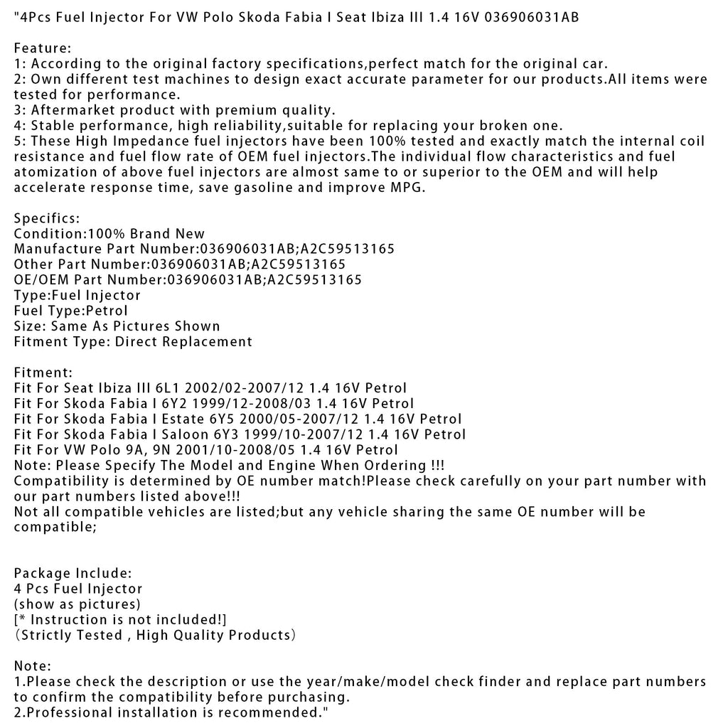 4 injecteurs de carburant pour VW Polo, Skoda Fabia I et Seat Ibiza III 1.4 16V 036906031AB