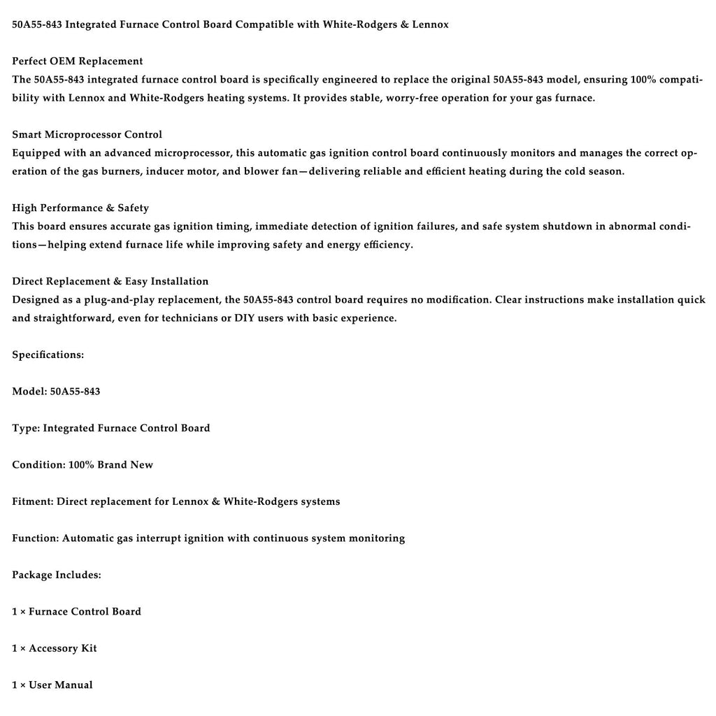 La carte de contrôle intégrée 50A55-843 est spécialement conçue pour remplacer le modèle d'origine 50A55-843, garantissant une compatibilité totale avec les systèmes de chauffage Lennox et White-Rodgers. Elle assure un fonctionnement stable et sans souci de votre chaudière à gaz.