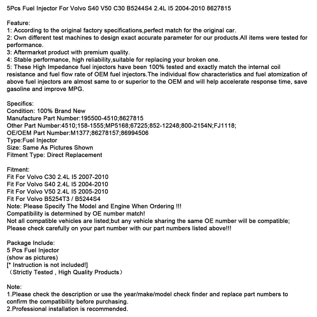 5 injecteurs de carburant pour Volvo S40 V50 C30 B5244S4 2.4L I5 2004-2010 8627815