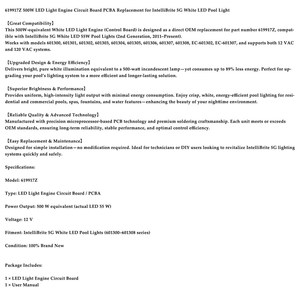 Ce moteur lumineux LED blanc équivalent à 500 W (carte de contrôle) est conçu comme un remplacement OEM direct pour la pièce numéro 619917Z, compatible avec les lampes de piscine LED blanches IntelliBrite 5G 55 W (2e génération, 2011 à aujourd'hui).