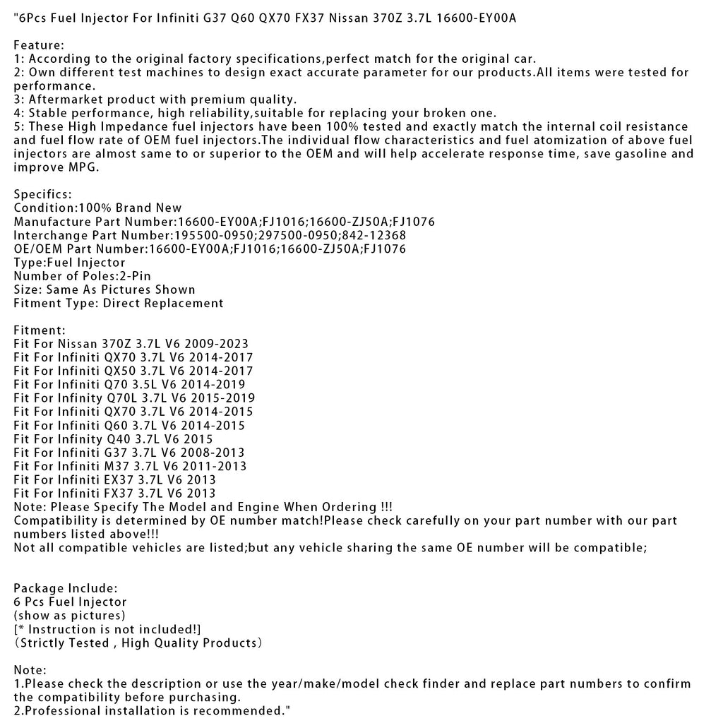 6 injecteurs de carburant pour Infiniti G37 Q60 QX70 FX37 Nissan 370Z 3.7L 16600-EY00A