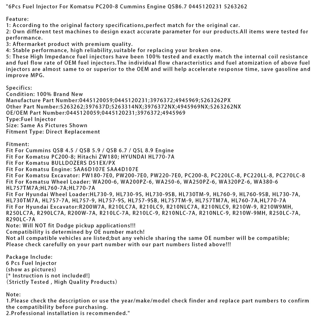 6 injecteurs de carburant compatibles avec le moteur Cummins Komatsu PC200-8 QSB6.7 0445120231 5263262