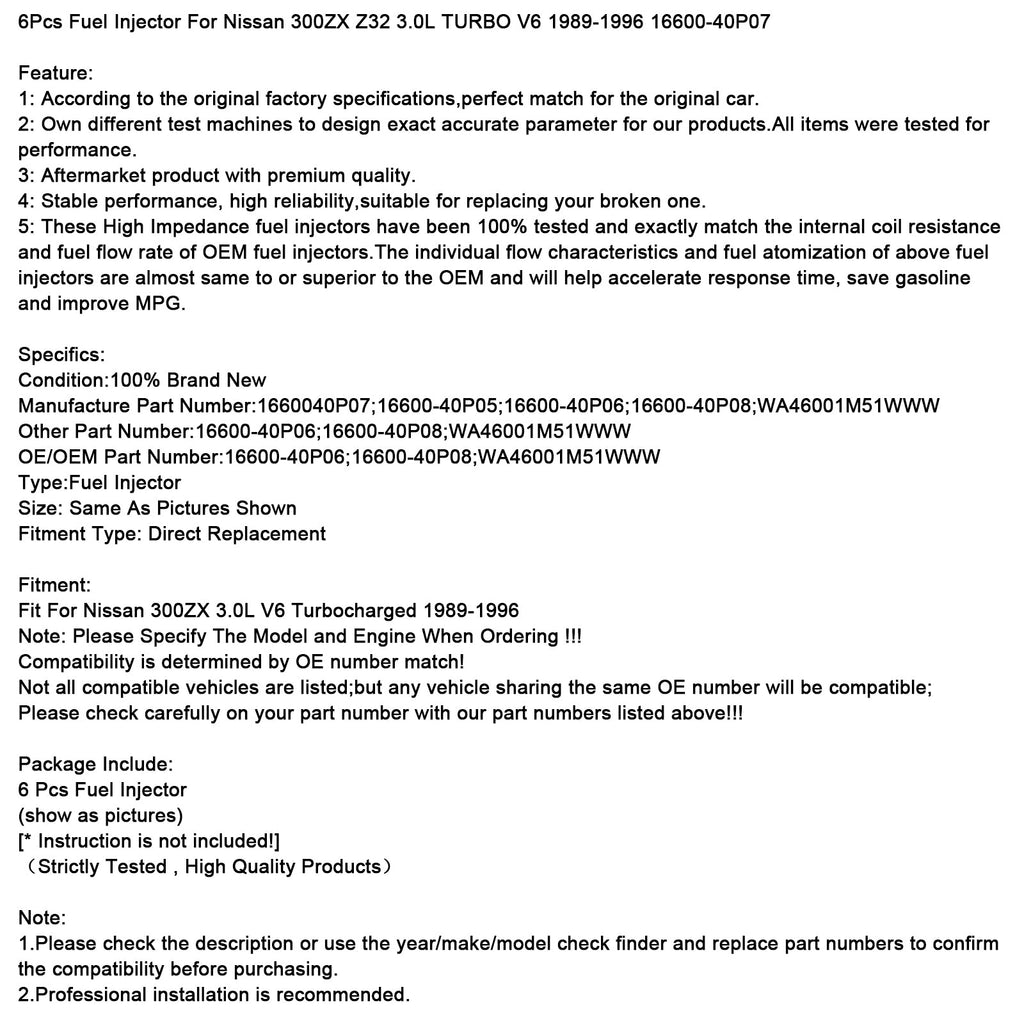 6 injecteurs de carburant compatibles avec Nissan 300ZX Z32 3.0L TURBO V6 1989-1996 16600-40P07