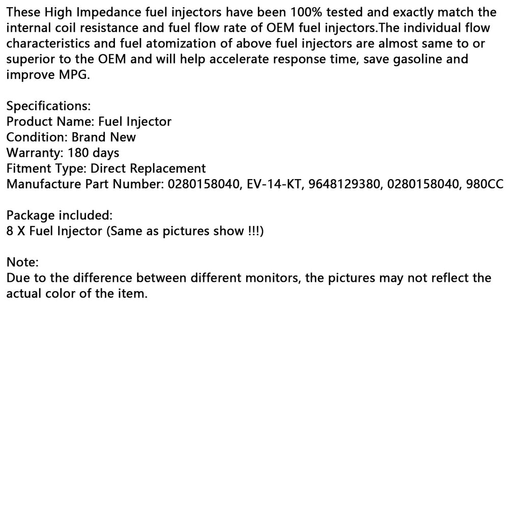 Ces injecteurs de carburant à haute impédance ont été testés à 100 % et correspondent exactement à la résistance de la bobine interne et au débit de carburant des injecteurs de carburant OEM. Les caractéristiques de débit individuelles et l'atomisation du carburant des injecteurs de carburant ci-dessus sont presque identiques ou supérieures à celles de l'OEM et aideront à accélérer le temps de réponse, à économiser de l'essence et à améliorer le MPG.