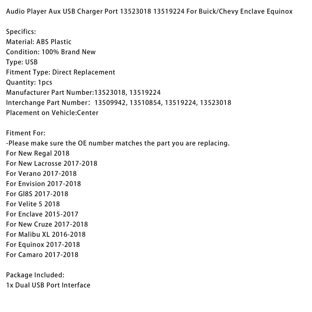 Lecteur audio avec port de charge auxiliaire USB 13523018 13519224 compatible avec Buick/Chevy Enclave Equinox