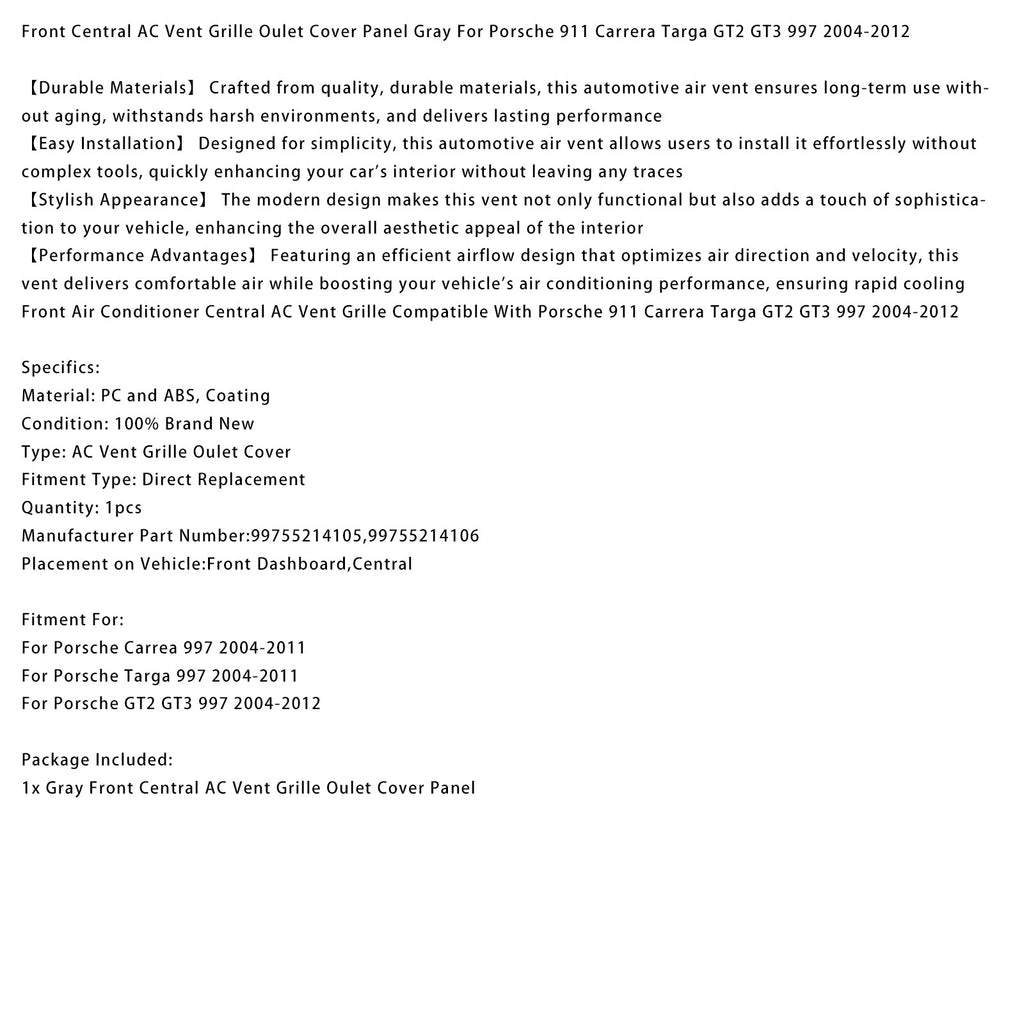 Grille de ventilation centrale de climatisation avant compatible avec Porsche 911 Carrera Targa GT2 GT3 997 2004-2012