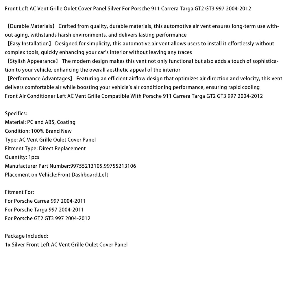 Cache de ventilation avant gauche argenté pour Porsche 911 Carrera Targa 997 2004-2012 99755213105 99755213106