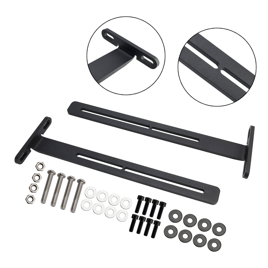 2 supports de fixation en acier en forme de T, 8 vis et 8 rondelles pour la quincaillerie de montage. 4 boulons et écrous plus longs.