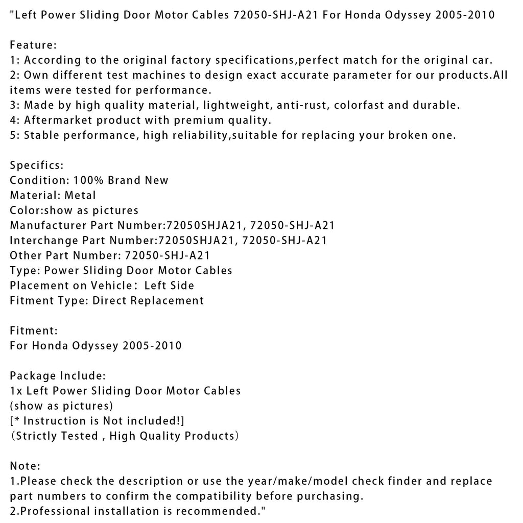 Câbles de moteur de porte coulissante électrique gauche 72050-SHJ-A21 compatibles avec Honda Odyssey 2005-2010