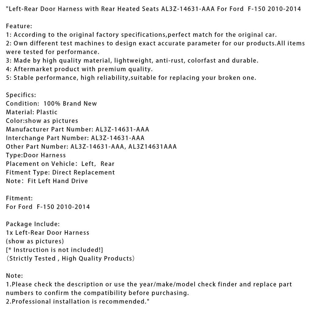 Faisceau de câbles de portière arrière gauche avec sièges chauffants arrière AL3Z-14631-AAA pour Ford F-150 2010-2014