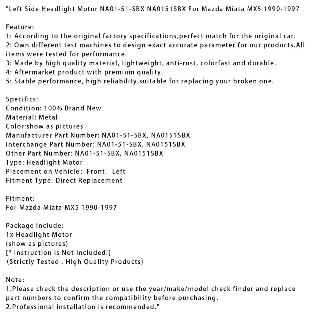 Moteur de phare gauche NA01-51-SBX NA0151SBX pour Mazda Miata MX5 1990-1997