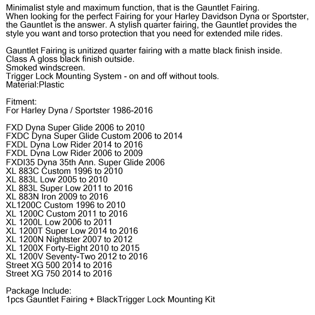 Style minimaliste et fonctionnalité maximale : voilà le carénage Gauntlet. Si vous cherchez le carénage idéal pour votre Harley Davidson Dyna ou Sportster, le Gauntlet est la solution. Élégant, le Gauntlet offre le style recherché et la protection nécessaire pour les longs trajets. Il est proposé en finition noir brillant de classe A, facile à peindre.