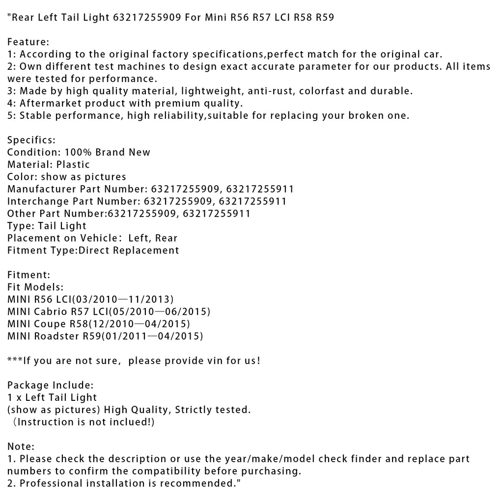 Feu arrière gauche 63217255909 pour MINI R56 R57 LCI R58 R59