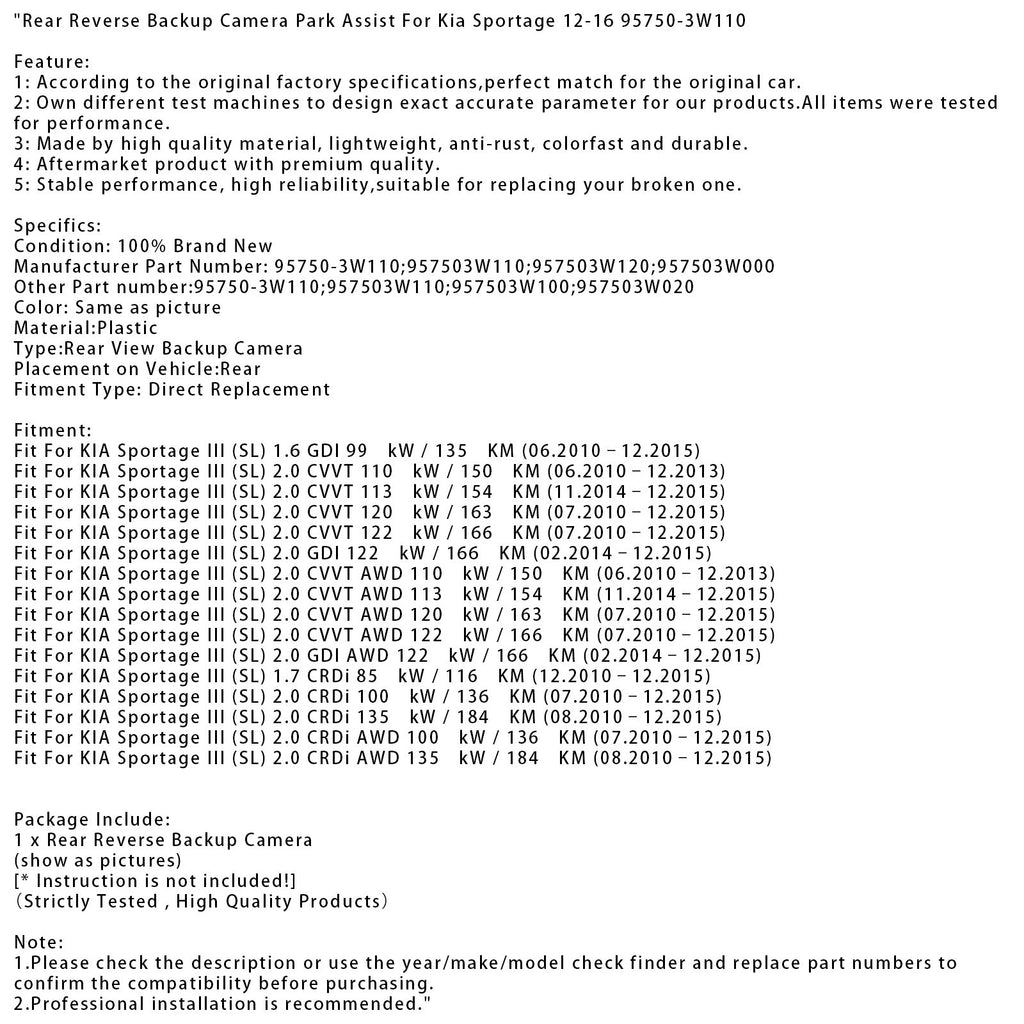 Caméra de recul avec assistance au stationnement pour Kia Sportage 12-16 95750-3W110