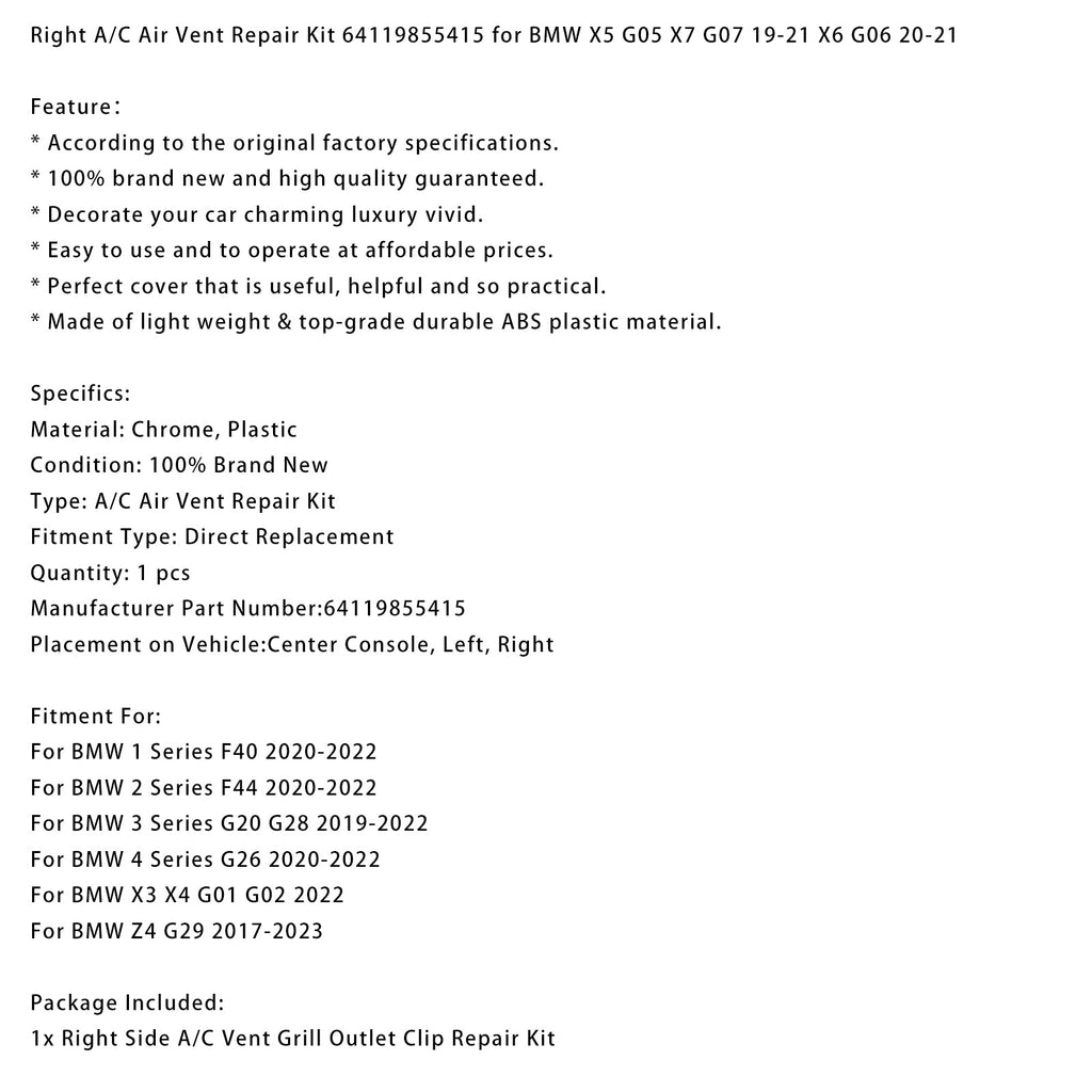 Kit de réparation de grille d'aération droite 64119855415 pour BMW X5 G05, X7 G07 (2019-2021) et X6 G06 (2020-2021)