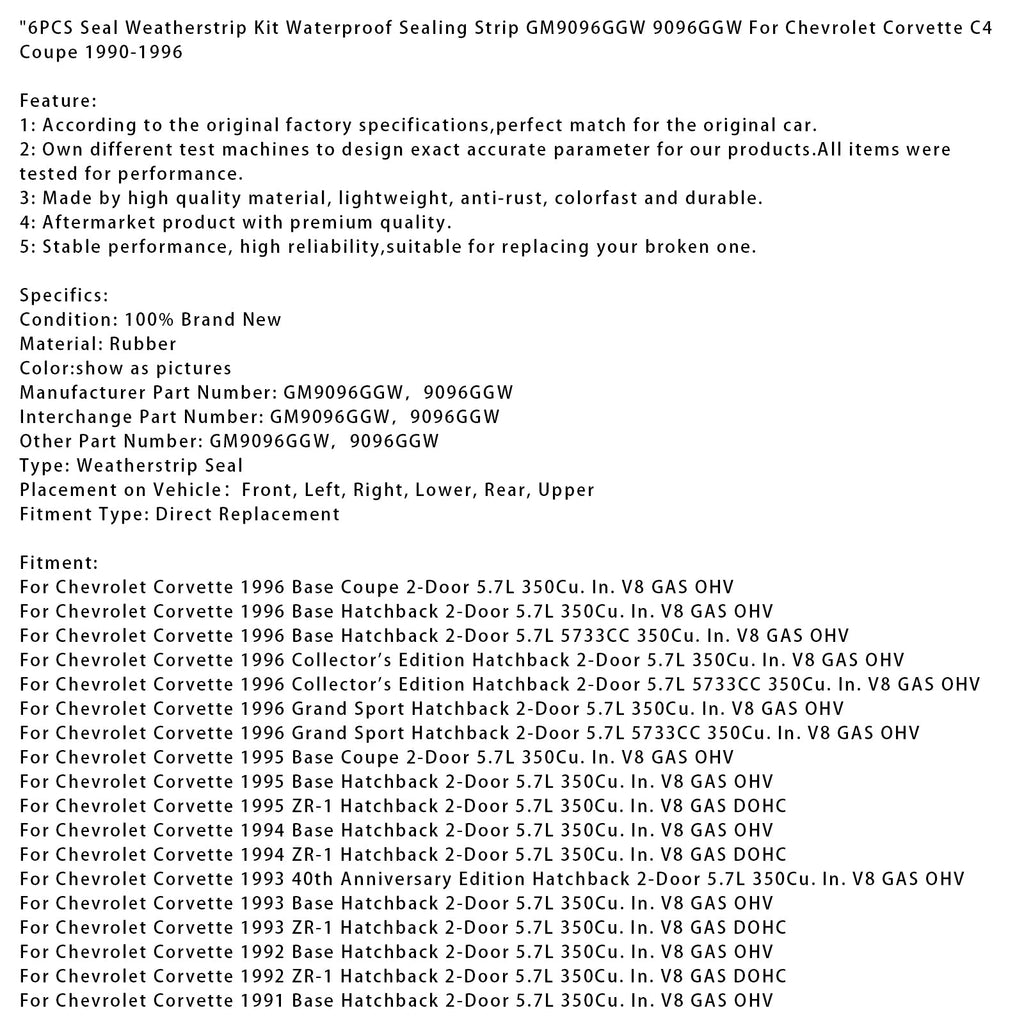 Kit de 6 joints d'étanchéité étanches GM9096GGW 9096GGW pour Chevrolet Corvette C4 Coupé 1990-1996
