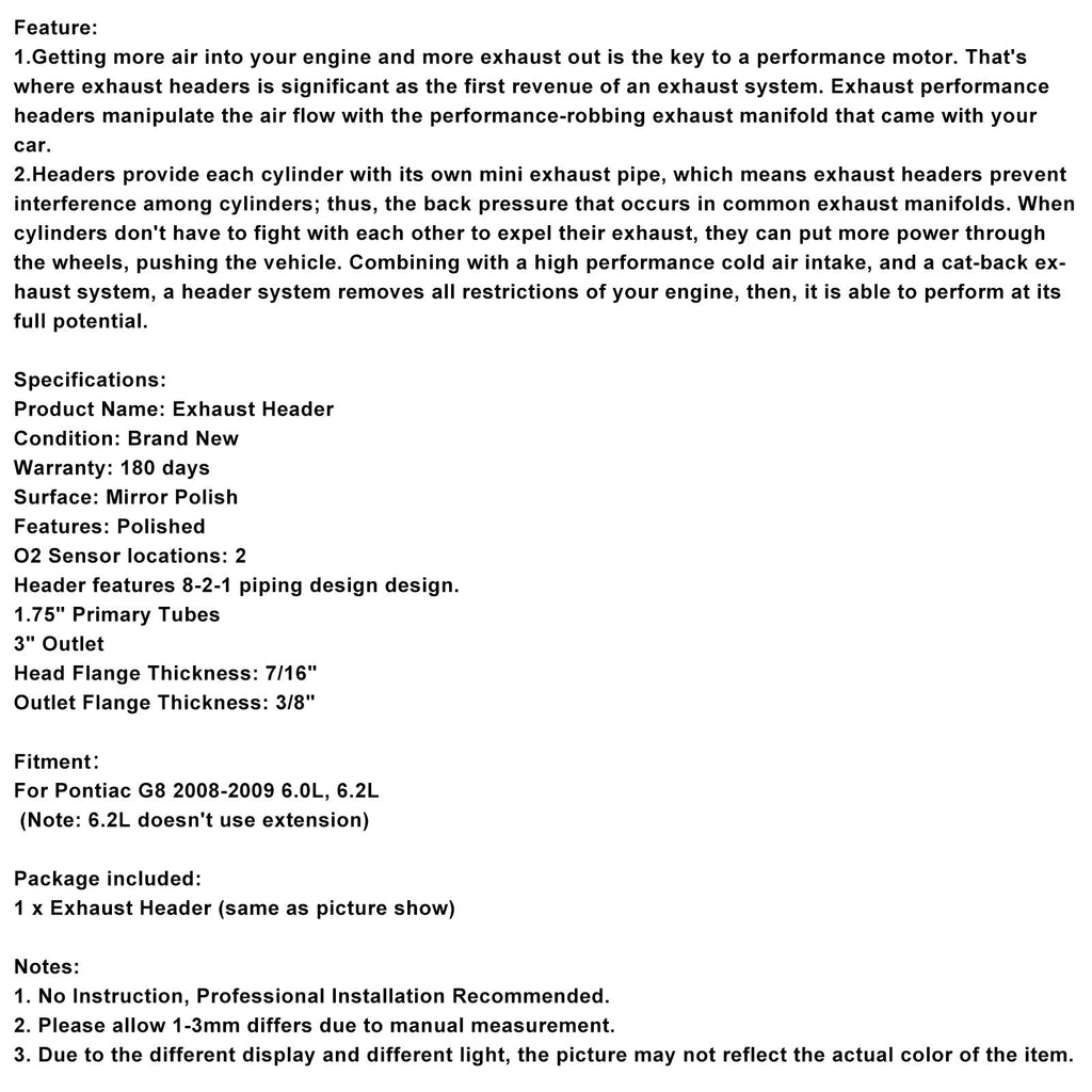 Collecteur d'échappement en acier inoxydable pour Pontiac G8 6.0L et 6.2L (2008-2009)
