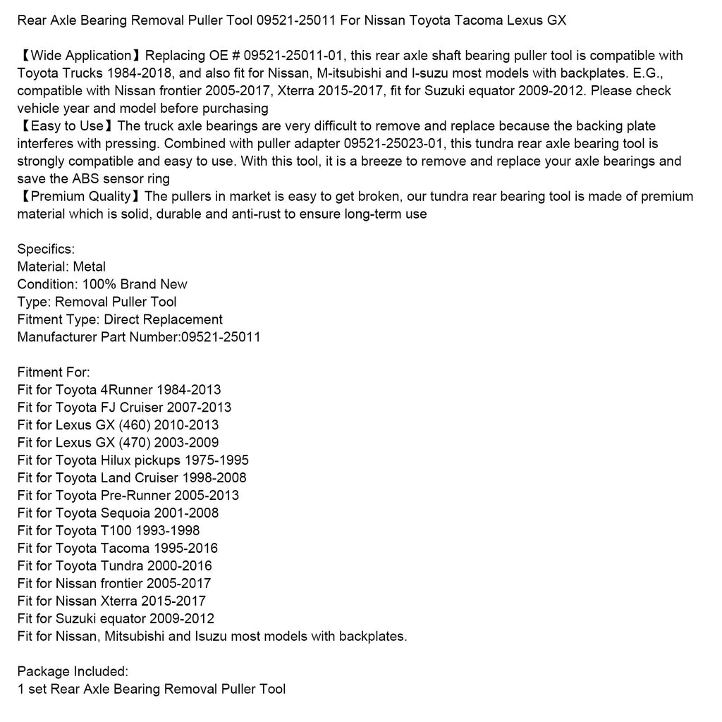 【Široka uporaba】Ta snemalec ležajev zadnje osi nadomešča originalno številko dela 09521-25011-01 in je združljiv s tovornjaki Toyota letnikov 1984–2018, pa tudi z večino modelov Nissan, Mitsubishi in Suzuki, opremljenih s podpornimi ploščami. Na primer, združljiv je z modeli Nissan Frontier letnikov 2005–2017, Xterra letnikov 2015–2017 in Suzuki Equator letnikov 2009–2012. Pred nakupom preverite letnik in model vozila.