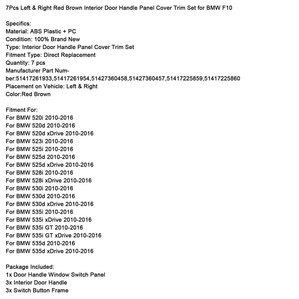 7-delni komplet rdeče-rjavih okrasnih oblog za leve in desne notranje kljuke vrat za BMW F10