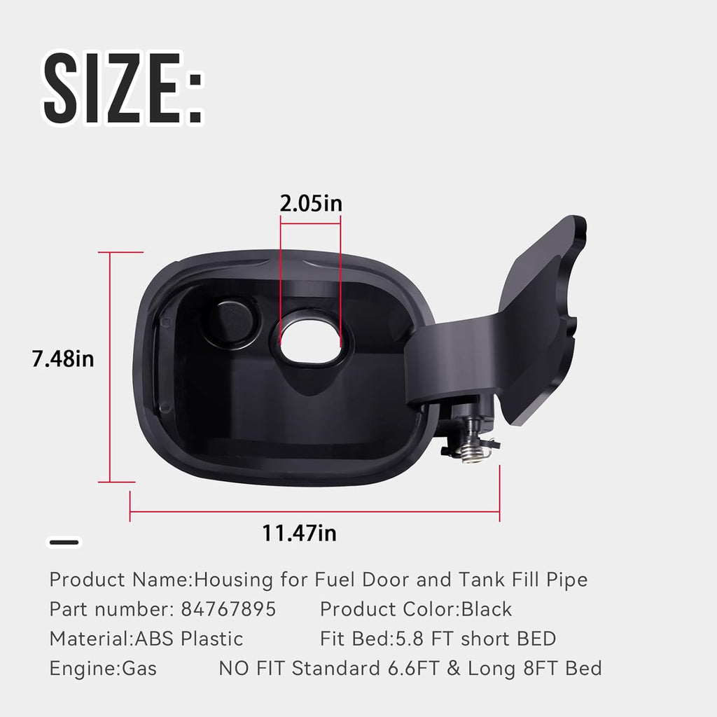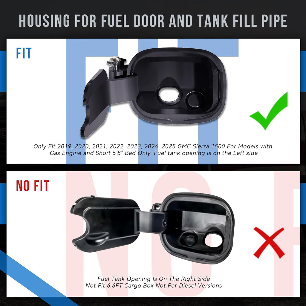 Uporabni model Črno ohišje cevi za polnjenje rezervoarja za gorivo ustreza modelom GMC Sierra 1500 letnikov 2019, 2020, 2021, 2022, 2023, 2024 in 2025 (modeli s kratkim bencinskim motorjem 1,72). samo m).