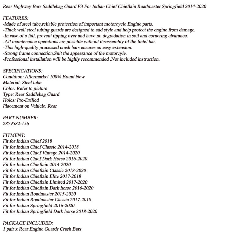 Zadnje zaščitne ročice za sedežno torbo, primerne za Indian Chief Chieftain Roadmaster Springfield 2014-2021