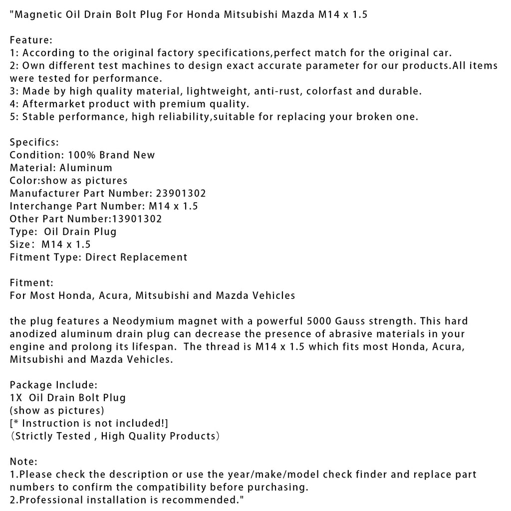 Ta pokrovček ima neodimski magnet z močjo 5 000 gaussov. Ta trdo eloksiran aluminijast izpustni čep zmanjšuje prisotnost abrazivnih materialov v motorju in podaljšuje njegovo življenjsko dobo. Njegov navoj M14 x 1,5 je združljiv z večino vozil Honda, Acura, Mitsubishi in Mazda.
