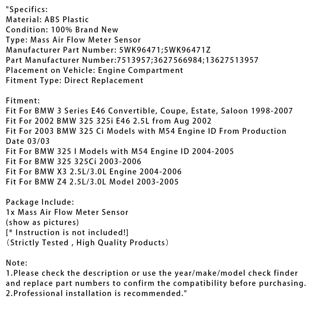 Senzor merilnika pretoka zraka za BMW serije 3 E46 E83 E85 X3 Z4 325i 325Ci 5WK96471