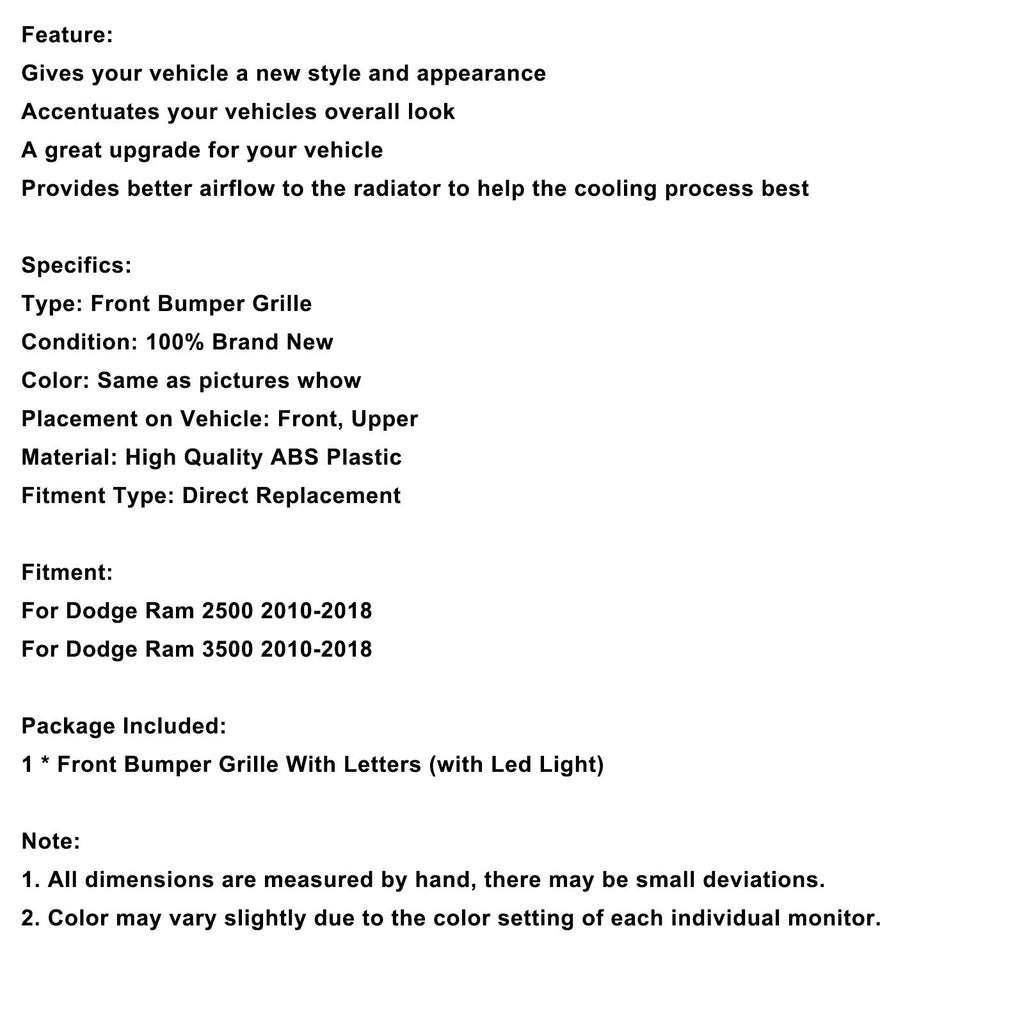 Sprednja maska odbijača, združljiva z Ram 2500/3500 Laramie Limited 2010-2018 z LED osvetlitvijo
