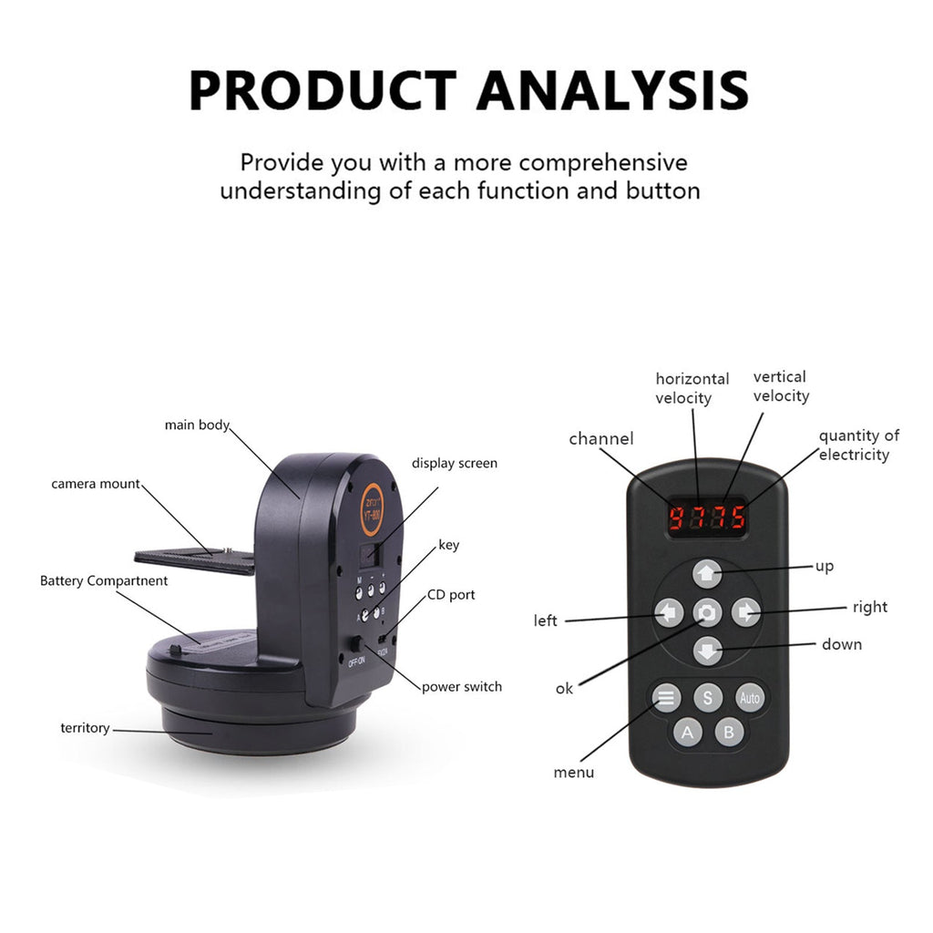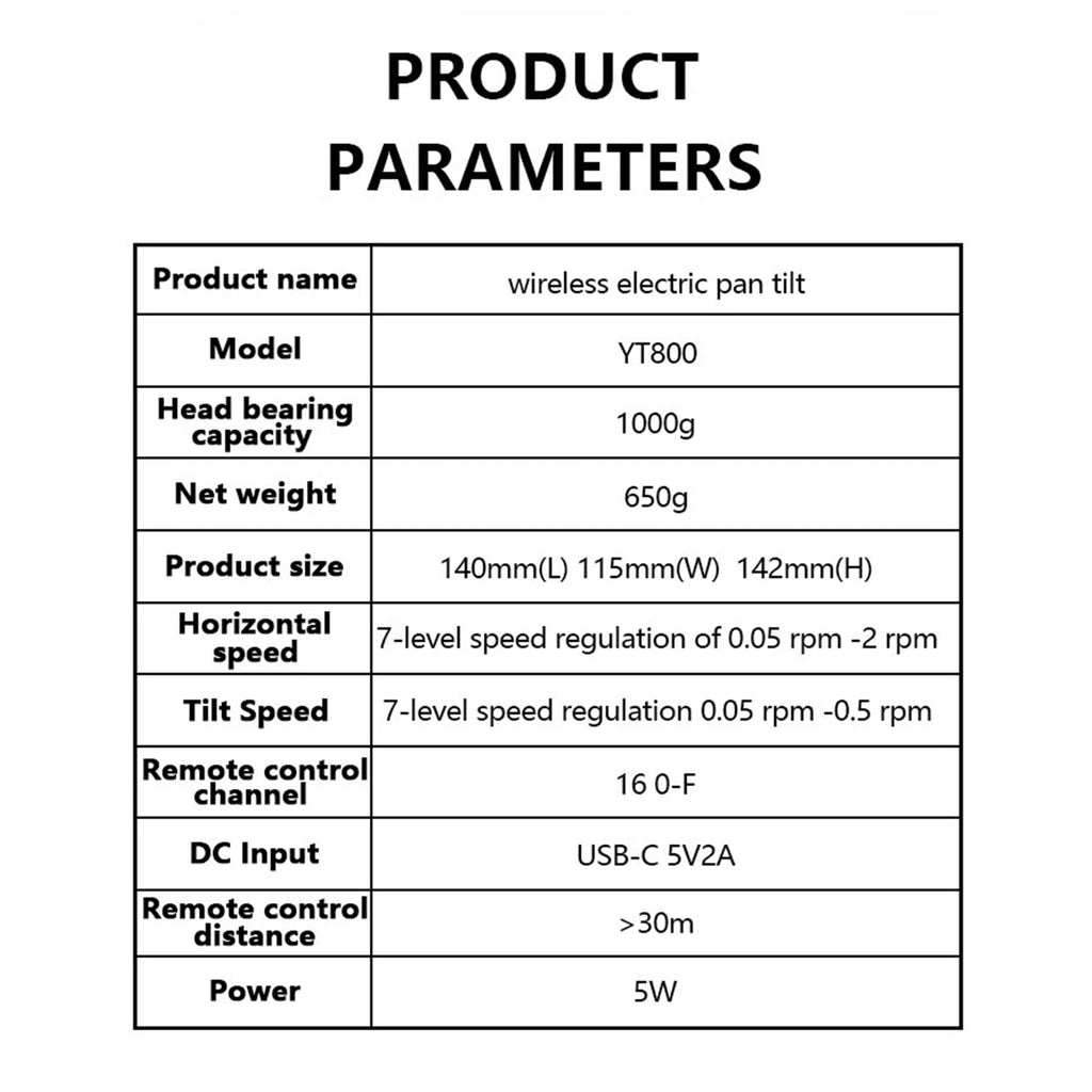 Električna platforma za daljinsko upravljanje YT-800 v oblaku poganja koračni motor, ki zagotavlja visoko natančnost pozicioniranja, visoko stopnjo tega gimbal-a, vertikalno vertikalno hitrost, območje regulacije hitrosti od 2 do 0,05 vrt/min in široko območje regulacije hitrosti. Na voljo sta 2 prednastavljena položaja, nastavite lahko 2 fiksna položaja, z enim klikom pa lahko nastavite tudi umik. Yundai lahko skenira z nastavljeno hitrostjo med točko A in B. YT800 Yundai nosi 1 kg in je primeren za običajne mobilne telefone, fotoaparate in enojne mikro kamere. Pod gimbalom so 1/4 luknje za vijake, kar omogoča priročno namestitev na stojalo. Vgrajena baterija 18650 se lahko široko uporablja pri prenosih v živo, fotografiranju na prostem in drugih priložnostih.